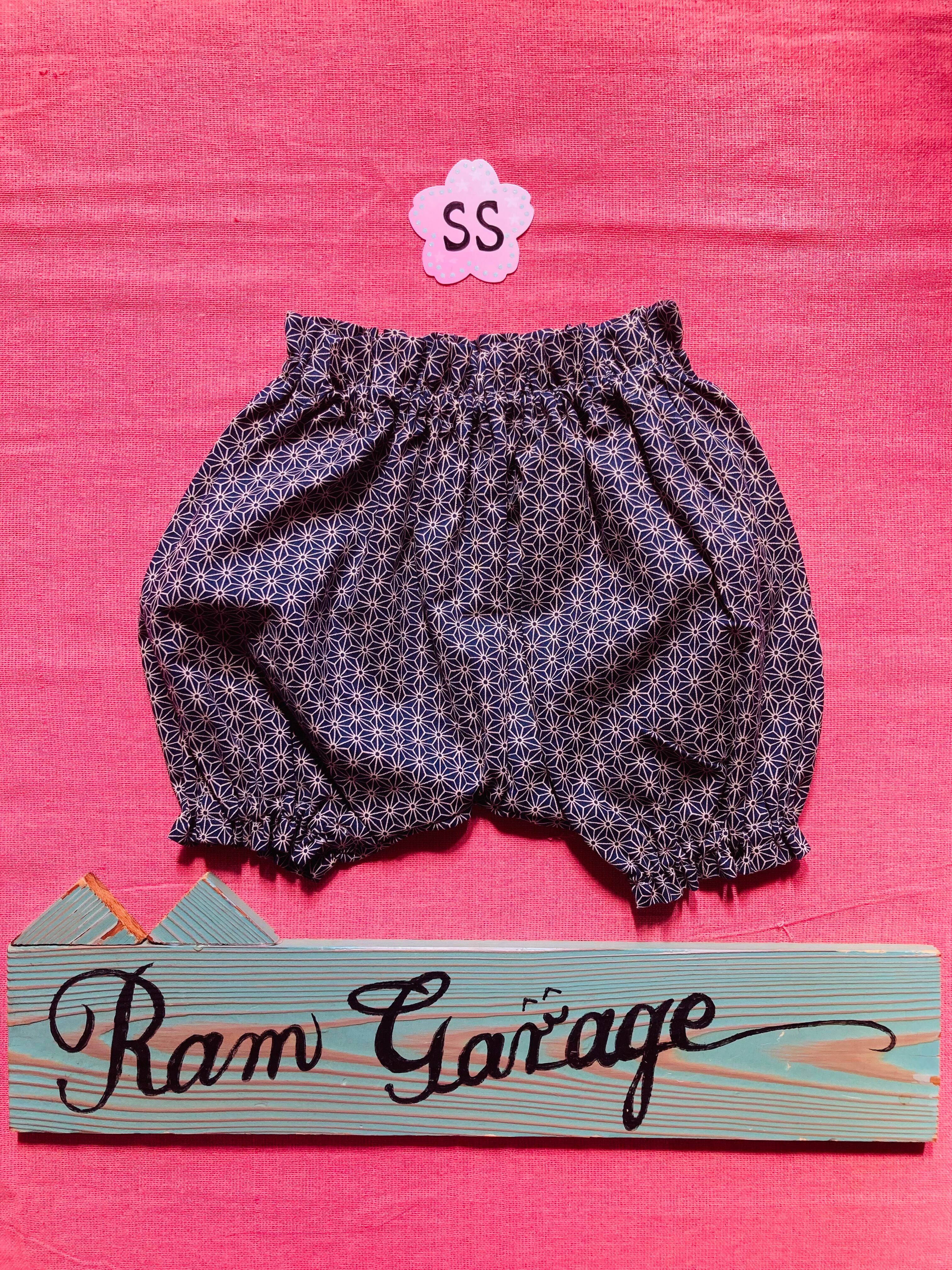 【SSサイズ】紺麻の葉柄|かぼちゃパンツ|和柄ズボン(身長75〜84cm)
