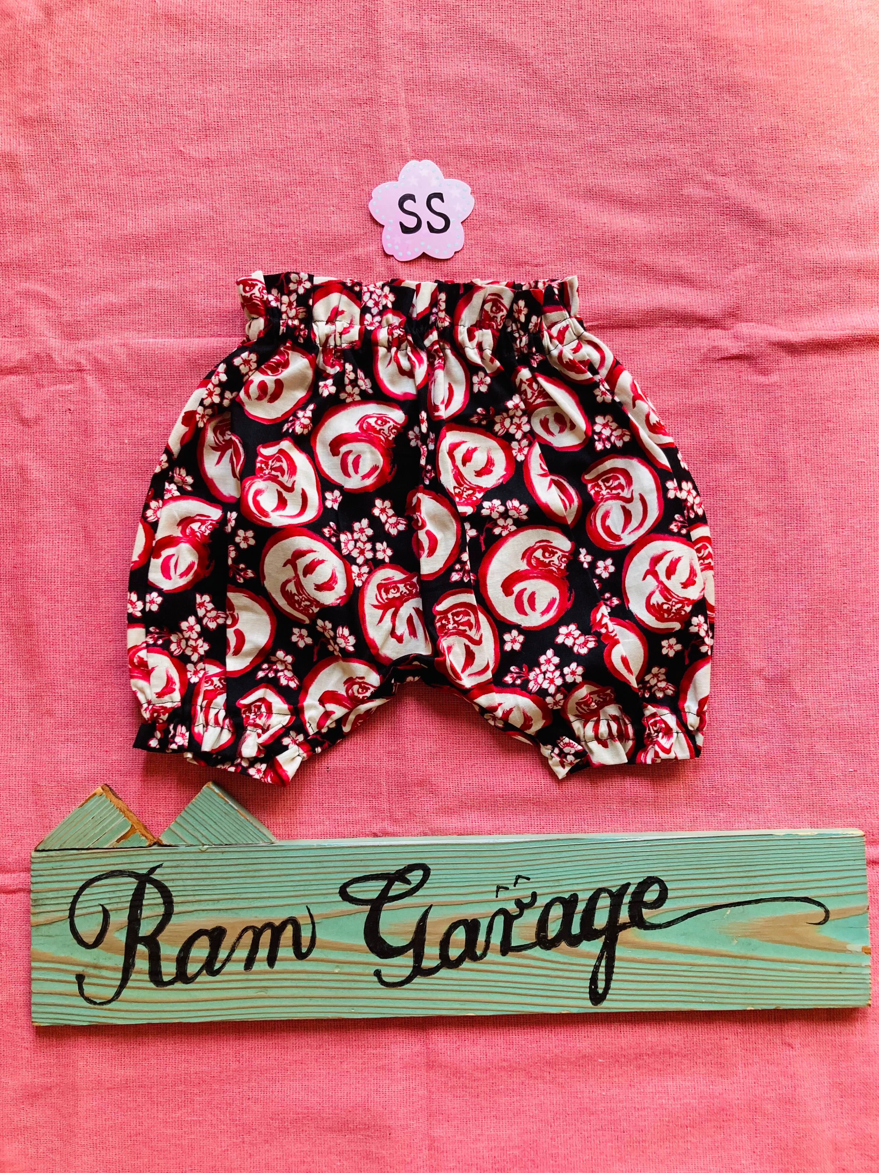 【SSサイズ|和柄ハーフパンツ】だるま×桜柄|日本製生地使用|ハンドメイド子ども服|男の子・女の子兼用|ベビー服 70〜80cm対応