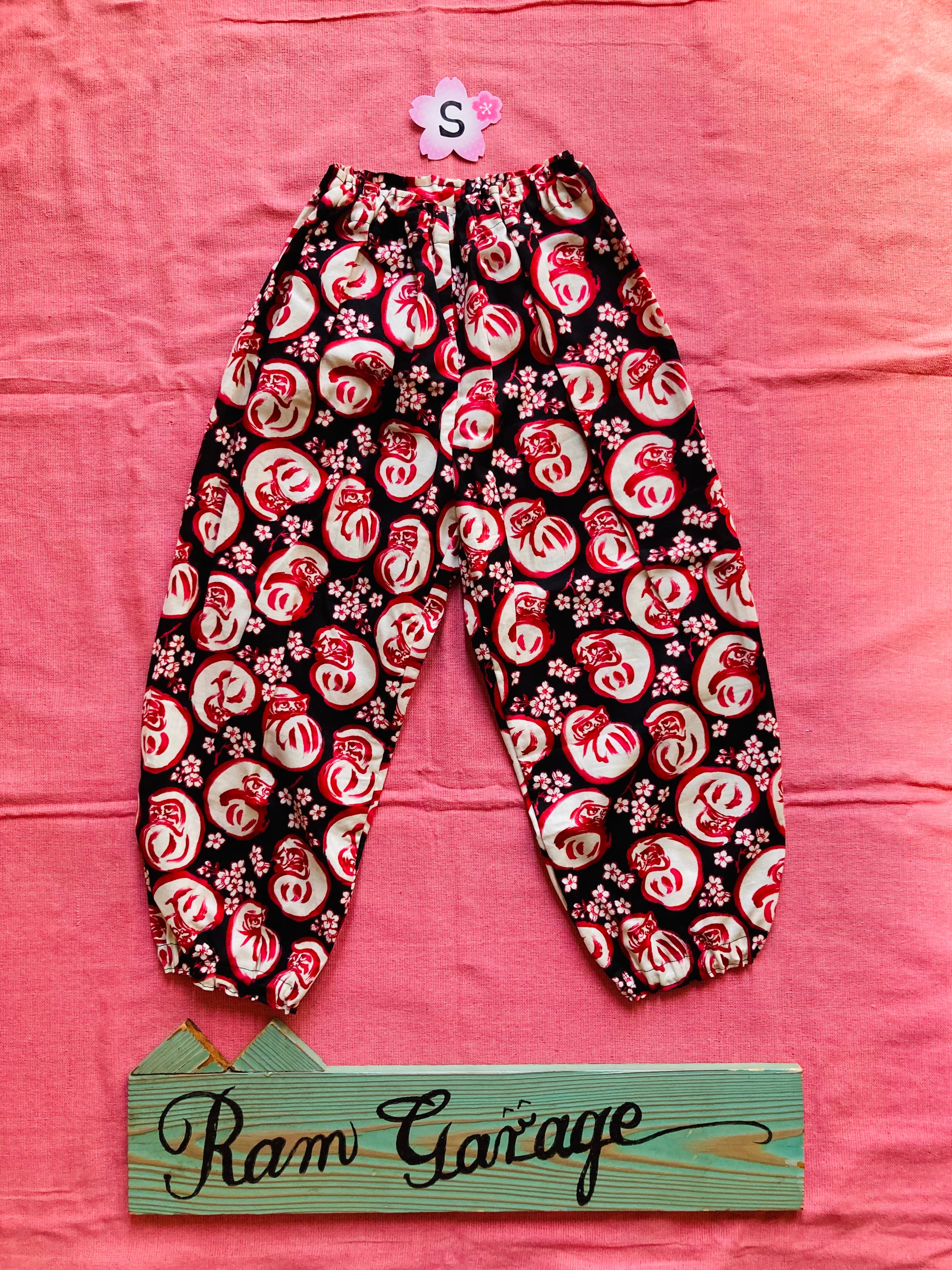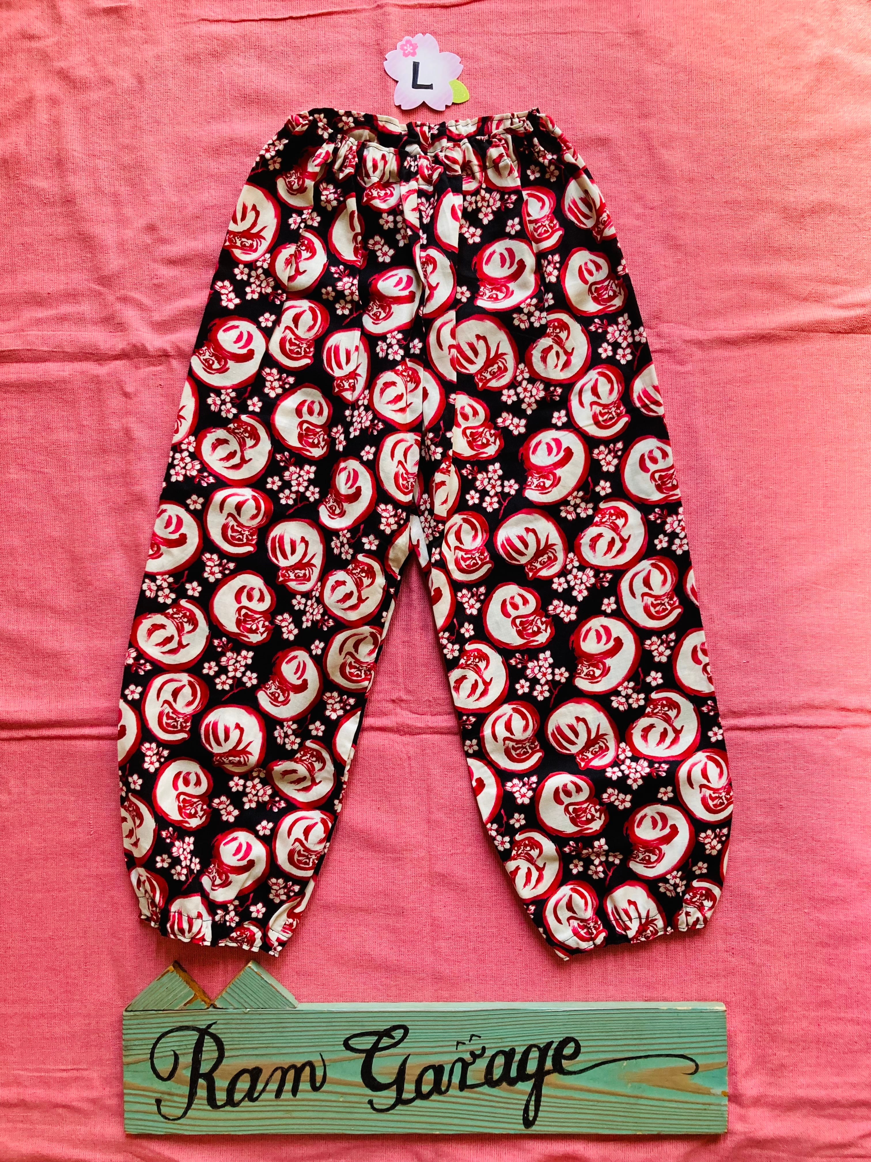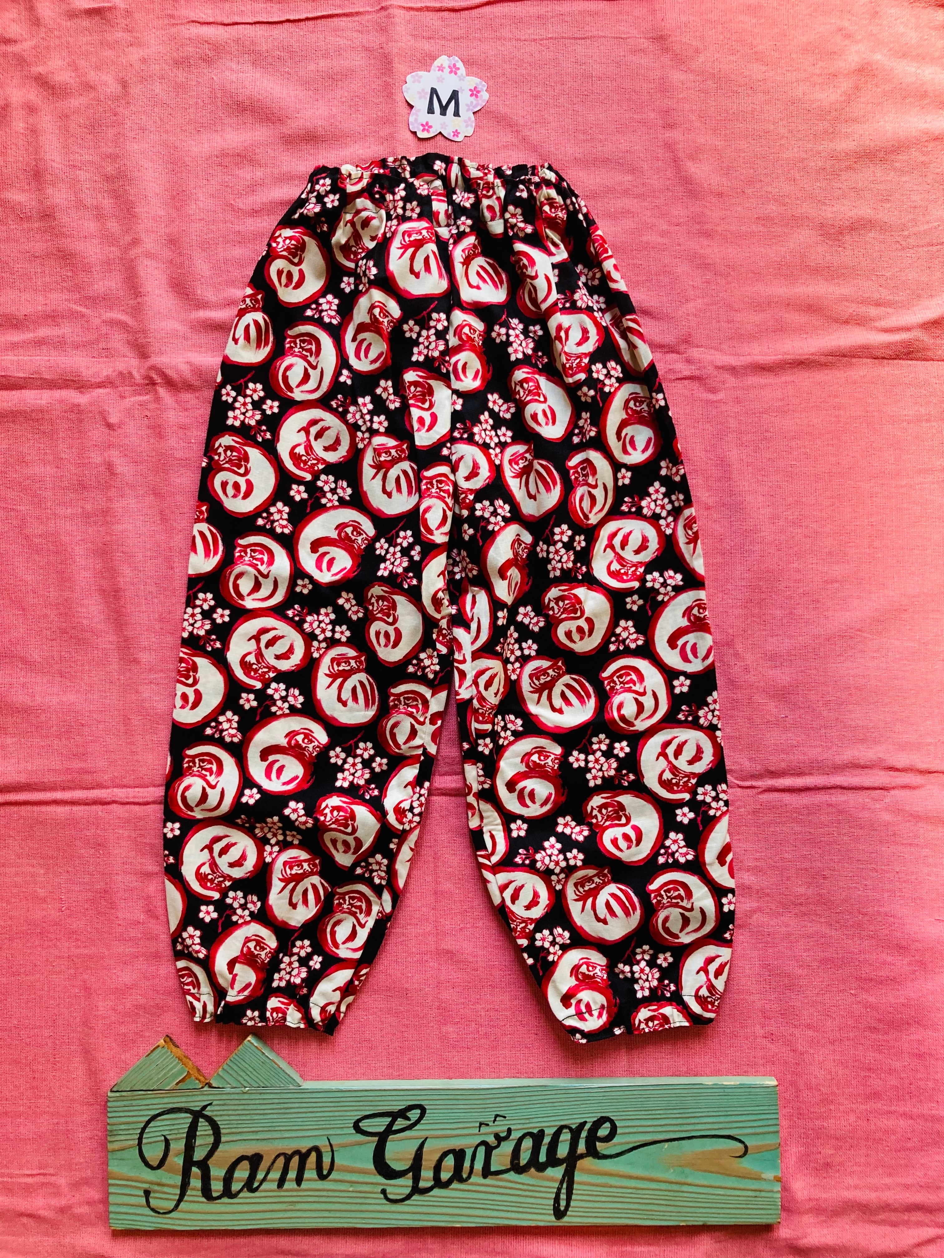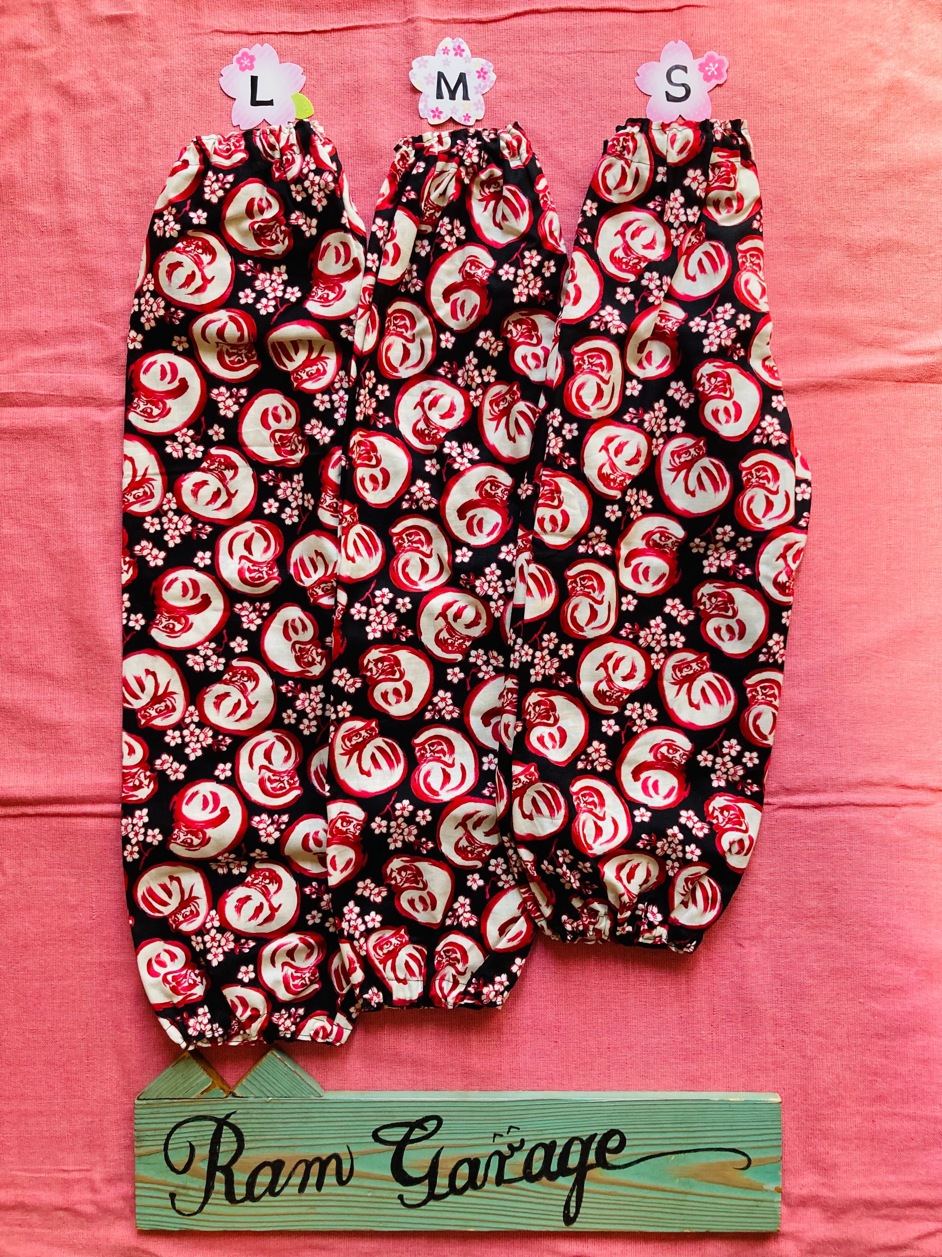 ラムガレージの大人気「だるま×桜柄」を使用した、S〜Lサイズ対応のハンドメイドもんぺズボンです。